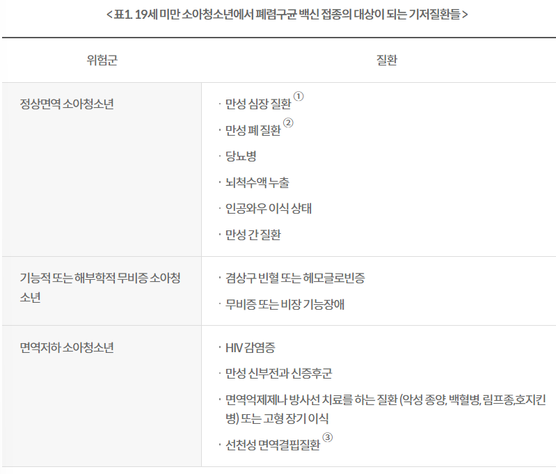 ▼19세 미만 소아청소년에게 폐렴구균 백신 접종 대상이 되는 기저질환자들▼