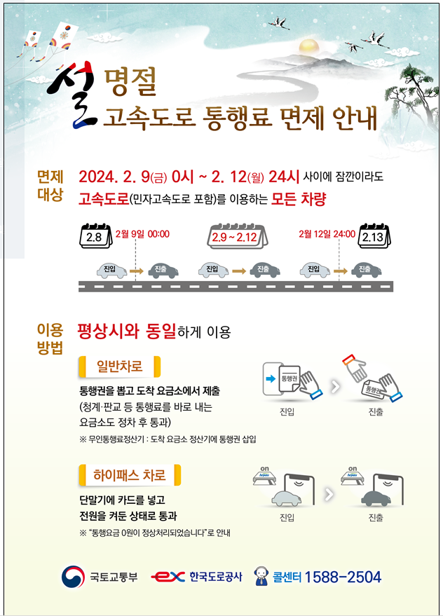 통행료 면제는 2월 9일 0시부터 2월12일 월요일 24시까지 총 4일간입니다.